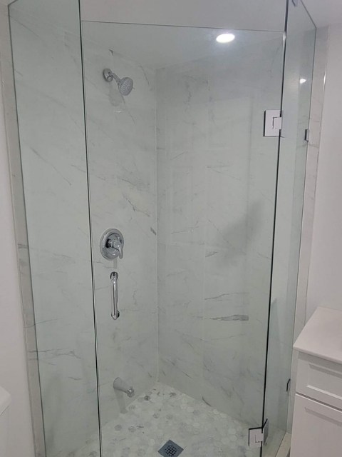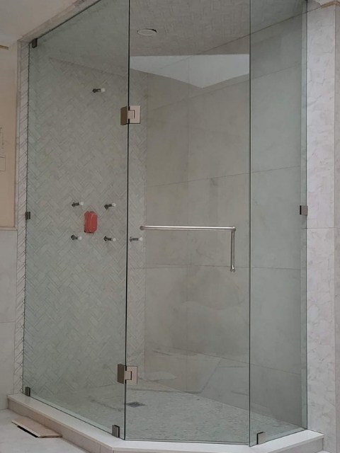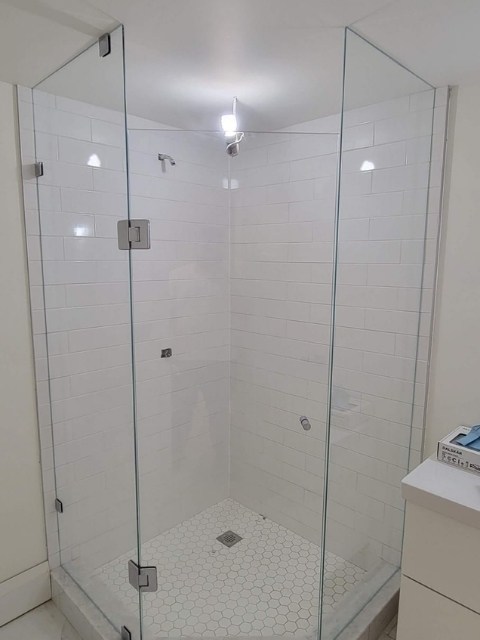 A Neo-Angle system features three frameless glass panels cutting off a corner wall (typically at a 135° angle) to create an efficient, stylish corner shower.